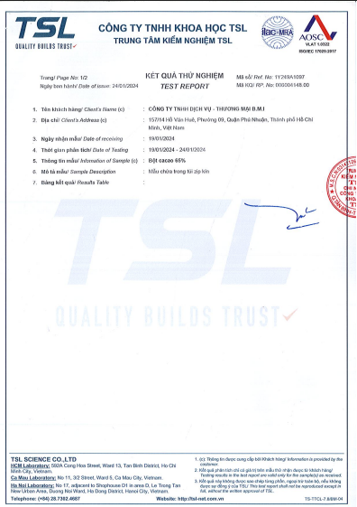 Bột ca cao nguyên chất 100% và 65% BMI được chiết xuất từ hạt ca cao tự nhiên, thuần khiết, chất lượng cao của vùng nguyên liệu Đắk Nông, không qua chế biến hay pha trộn bất kỳ chất bảo quản nào.