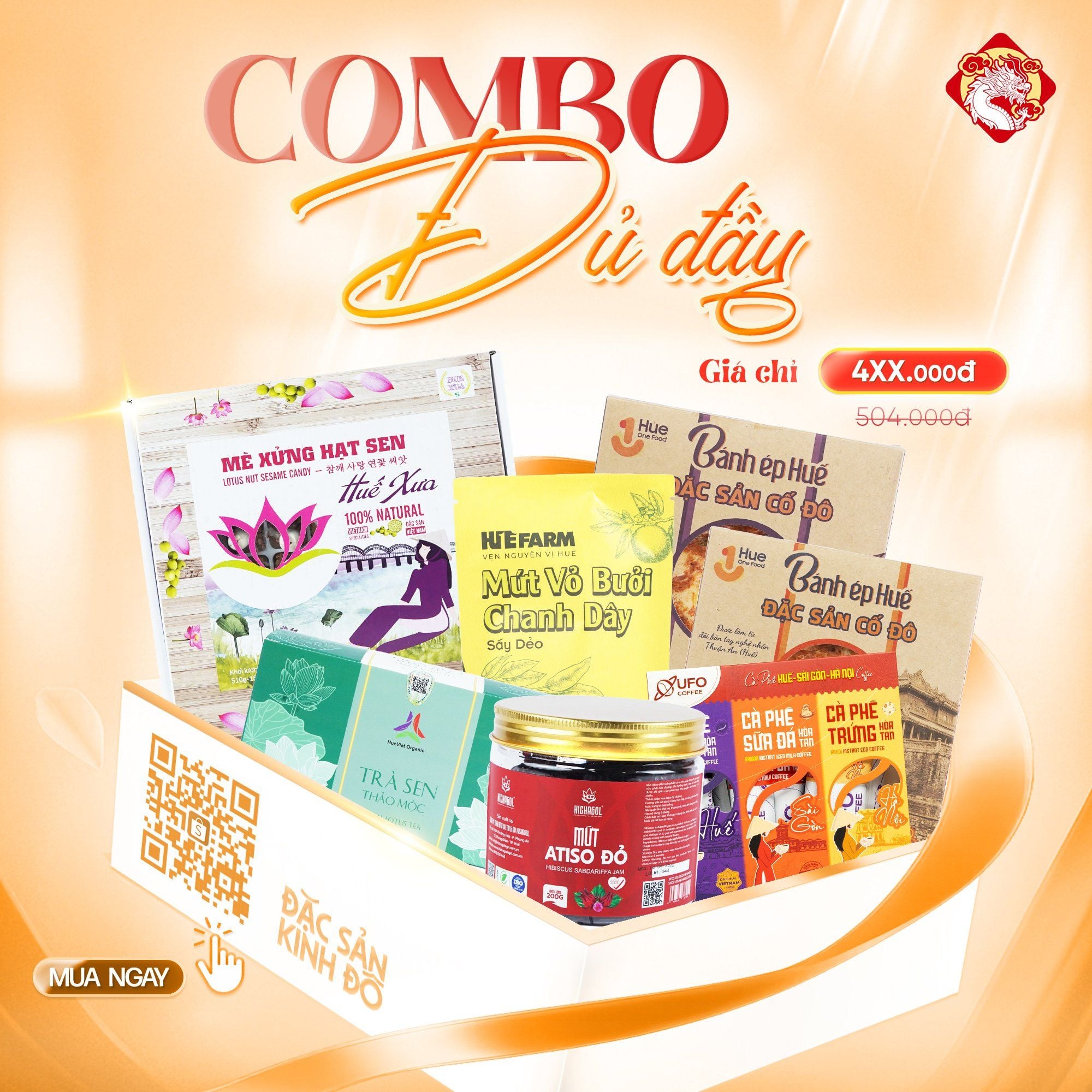 Set quà được mix sẵn với những đặc sản Huế chuẩn vị, tiện lợi và tinh tế, thích hợp để làm quà tặng hoặc thưởng thức cùng gia đình, bạn bè.
