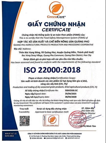 Tổ chức chịu trách nhiệm về hàng hóa: HỢP TÁC XÃ SẢN XUẤT VÀ CHẾ BIẾN NÔNG SẢN QUẢNG PHÚ
