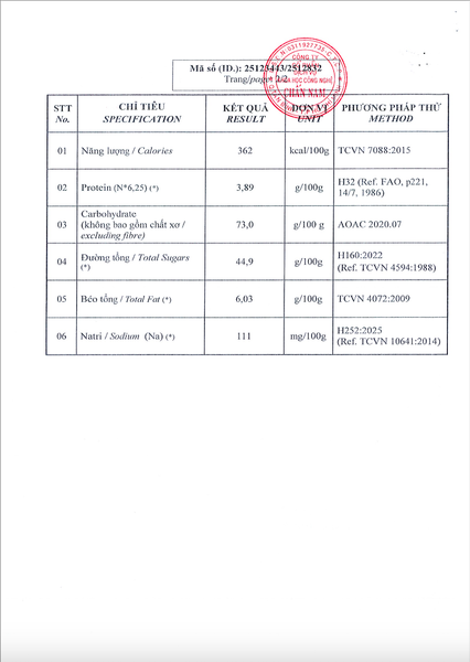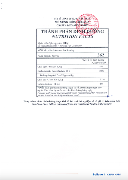 Thành phần: Đường, đậu phộng, mè, mạch nha, vani, bột gạo, bánh tráng